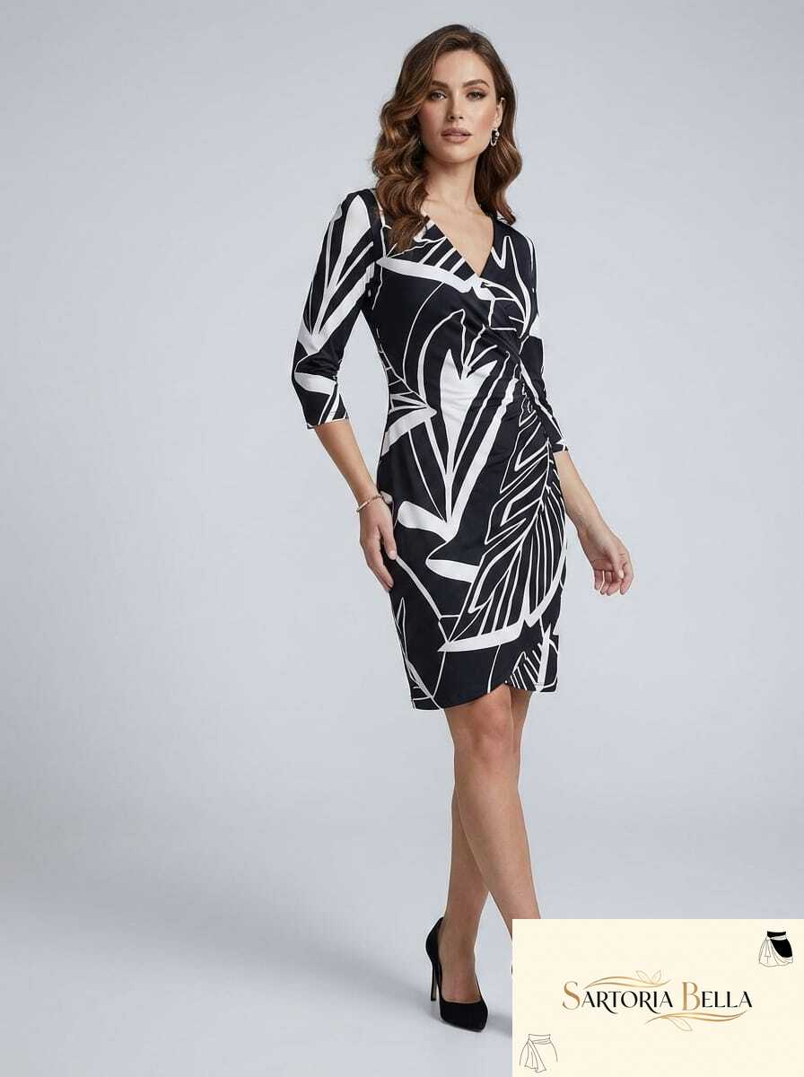 Sofisticação e modernidade se encontram neste vestido midi em preto e branco com estampa gráfica marcante. Com modelagem ajustada que valoriza a silhueta, ele possui decote em V transpassado e mangas 3/4, trazendo equilíbrio perfeito entre sensualidade e elegância.